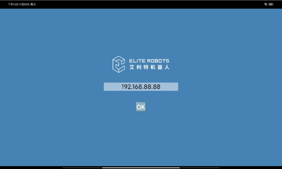 (4)打開(kāi)提前安裝好的Elite-APP,進(jìn)入如下頁(yè)面點(diǎn)擊OK,進(jìn)入網(wǎng)頁(yè)版示教器。