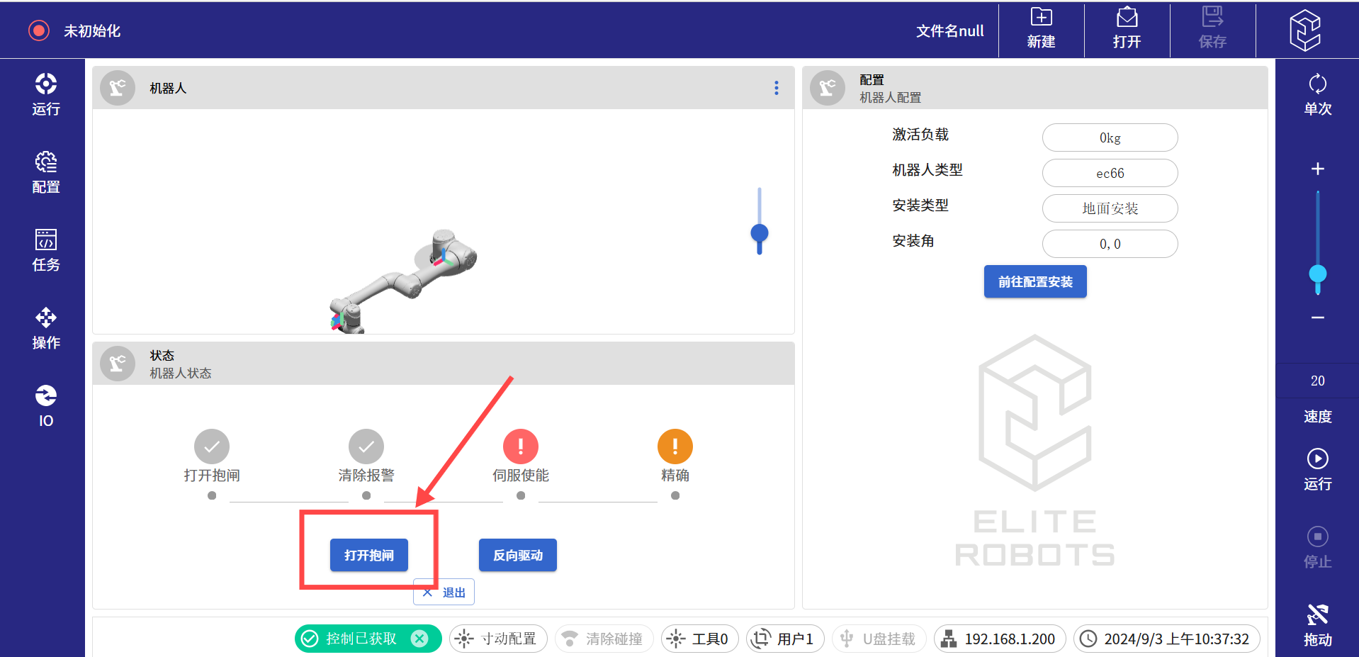 (8)進(jìn)入待機(jī)界面后,依次點(diǎn)擊打開(kāi)抱閘,伺服使能,以及精確。如果使用的是迷你控制柜,第一步還有一個(gè)機(jī)械臂上電的按鈕,點(diǎn)擊上電按鈕繼續(xù)往下執(zhí)行即可。