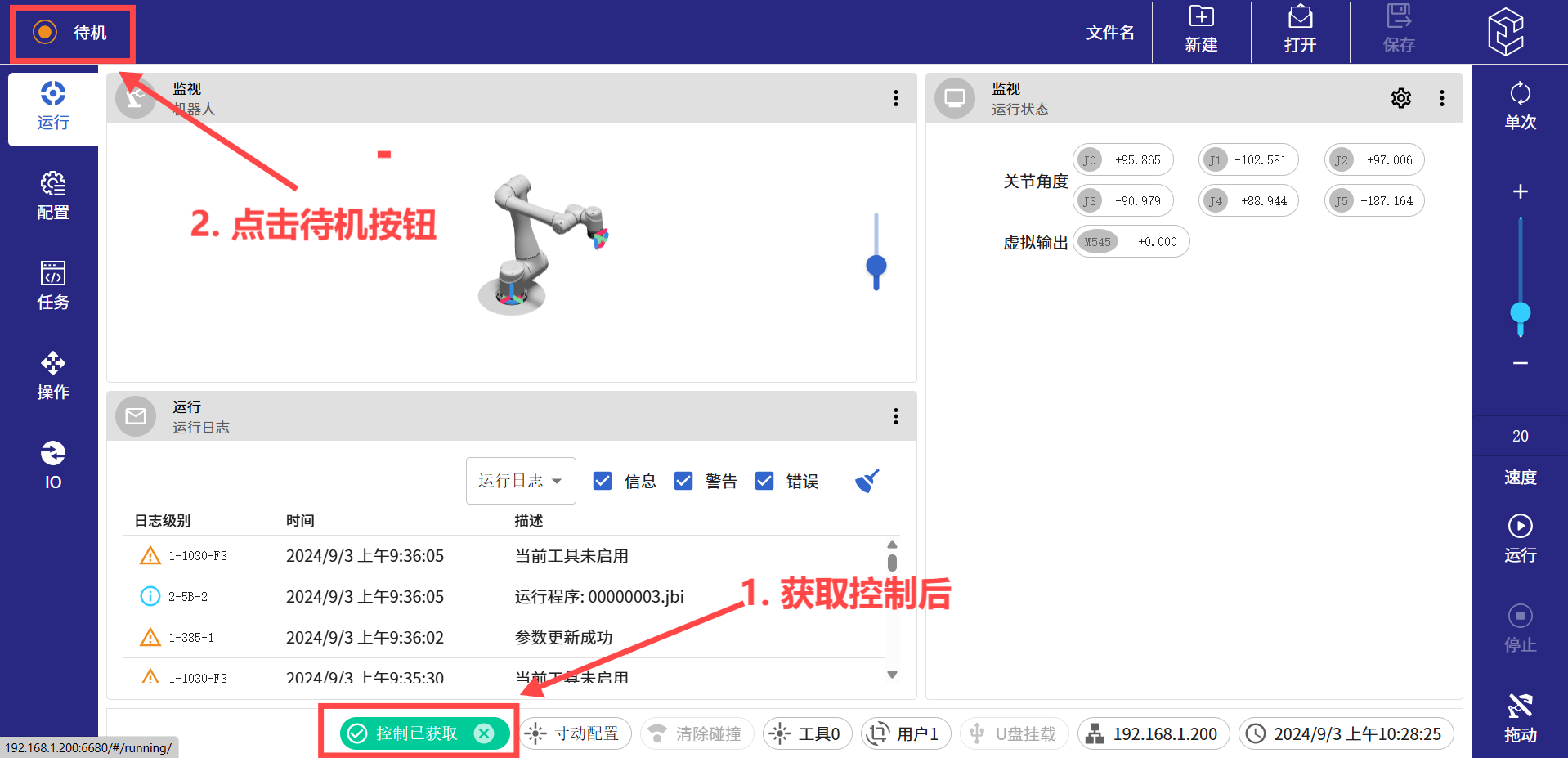 (5)進(jìn)入網(wǎng)頁(yè)版示教器后,和另外兩種方法一樣,先點(diǎn)擊下方菜單欄里面的獲取控制按鍵,等待獲取控制按鍵從白色變?yōu)榫G色后,即可操作網(wǎng)頁(yè)版示教器上面的操作界面。