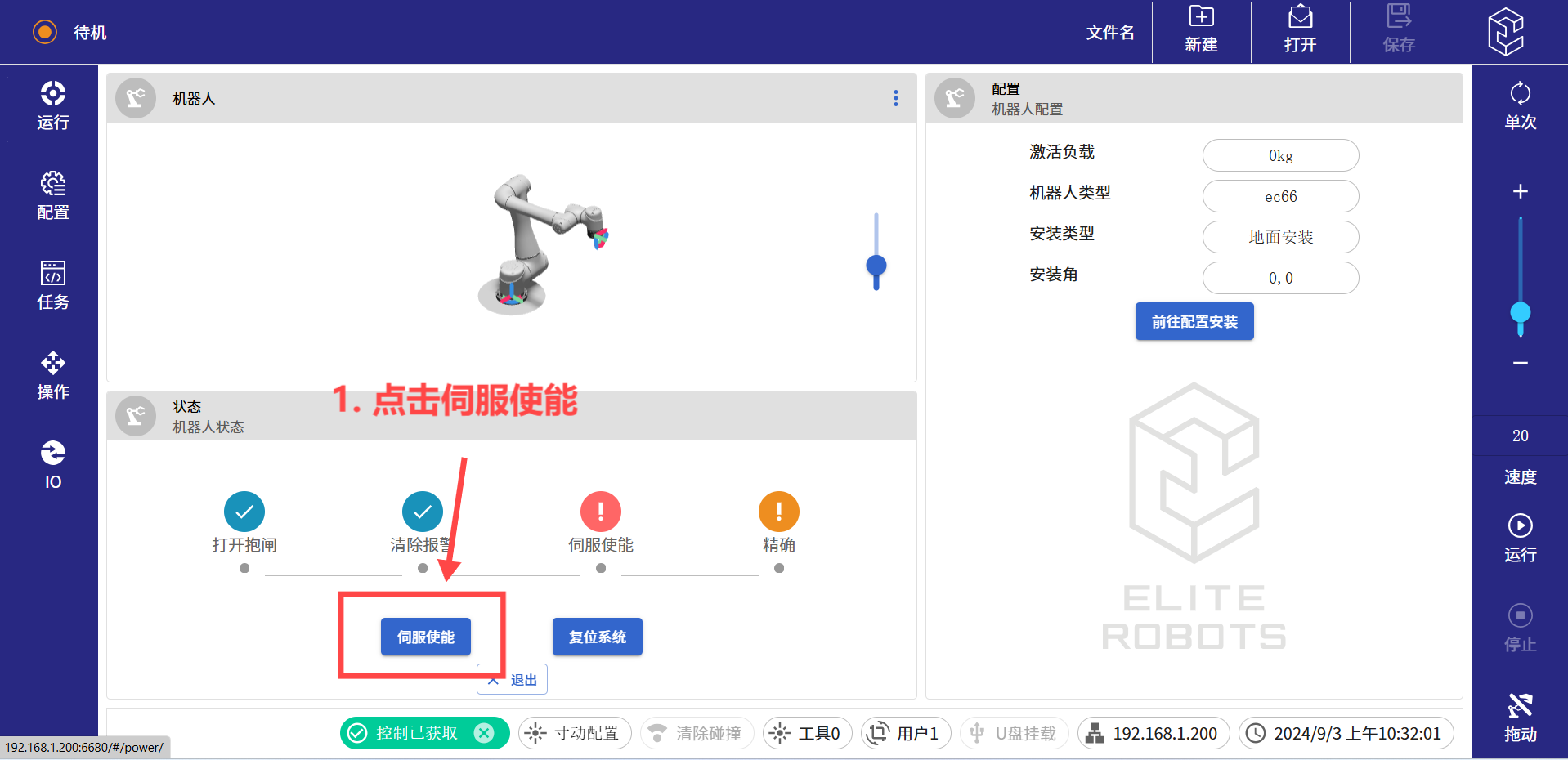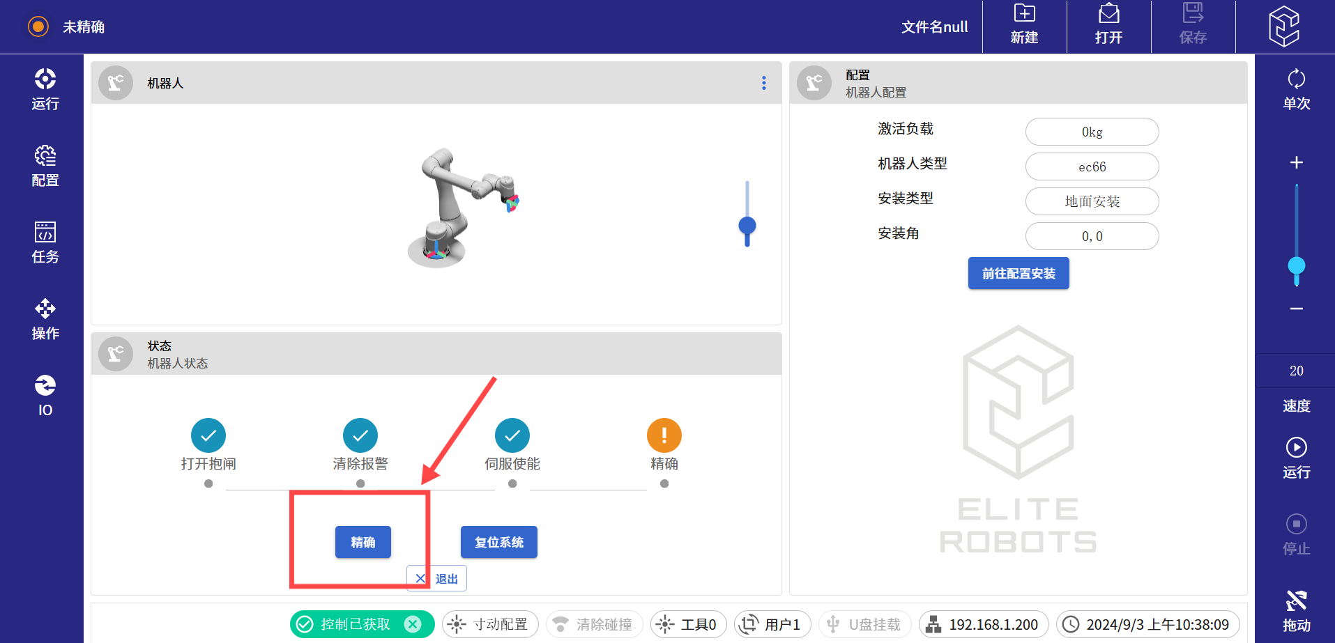 (6) 進(jìn)入待機(jī)界面后,依次點(diǎn)擊釋放抱閘,伺服使能,以及精確。如果使用的是迷你控制柜,第一步還有一個(gè)機(jī)械臂上電的按鈕,點(diǎn)擊上電按鈕繼續(xù)往下執(zhí)行即可。