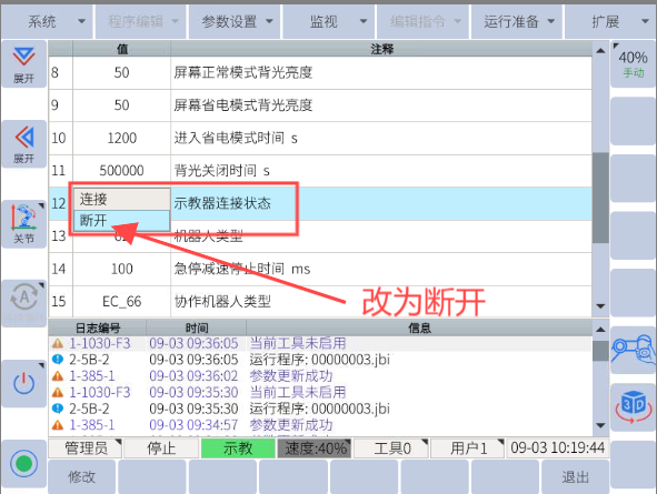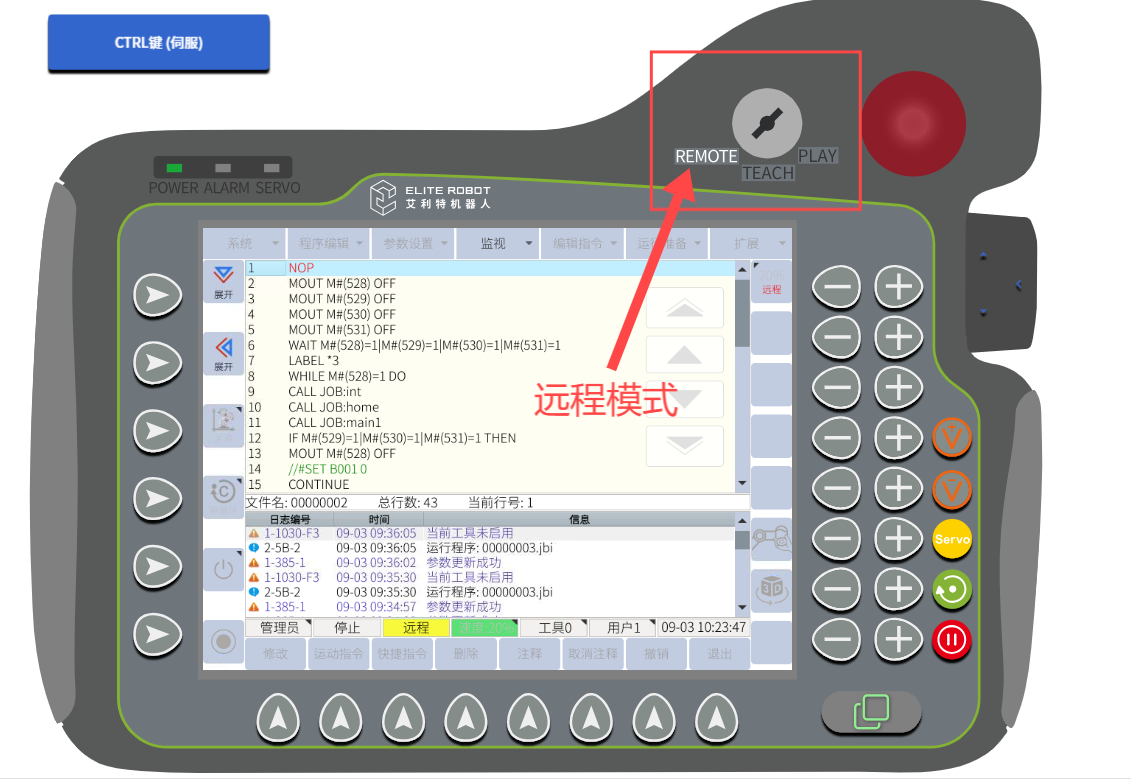 示教器右上角的鑰匙應(yīng)該切換置遠(yuǎn)程模式即可。