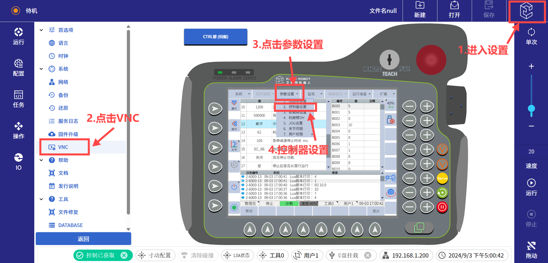 (5)如果機(jī)械臂報(bào)警提示“機(jī)械臂未進(jìn)入遠(yuǎn)程模式”或者“示教器連接狀態(tài)未斷開(kāi)”需進(jìn)行如下操作(示教器插頭已拔出)。進(jìn)入網(wǎng)頁(yè)版示教器后,需點(diǎn)擊下方獲取控制按鈕,獲取機(jī)械臂控制權(quán)限,否則機(jī)械臂無(wú)法操作。然后點(diǎn)擊右上角的設(shè)置界面,打開(kāi)VNC,然后點(diǎn)擊參數(shù)設(shè)置>控制器設(shè)置>示教器連接狀態(tài),把示教器連接狀態(tài)改為斷開(kāi)。