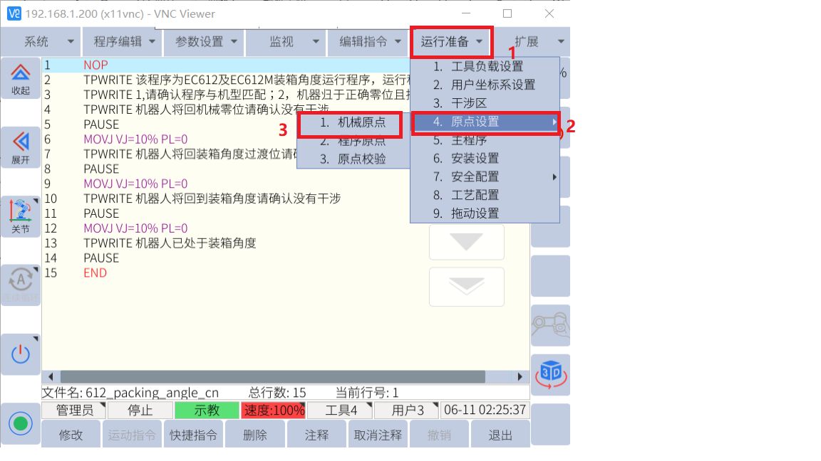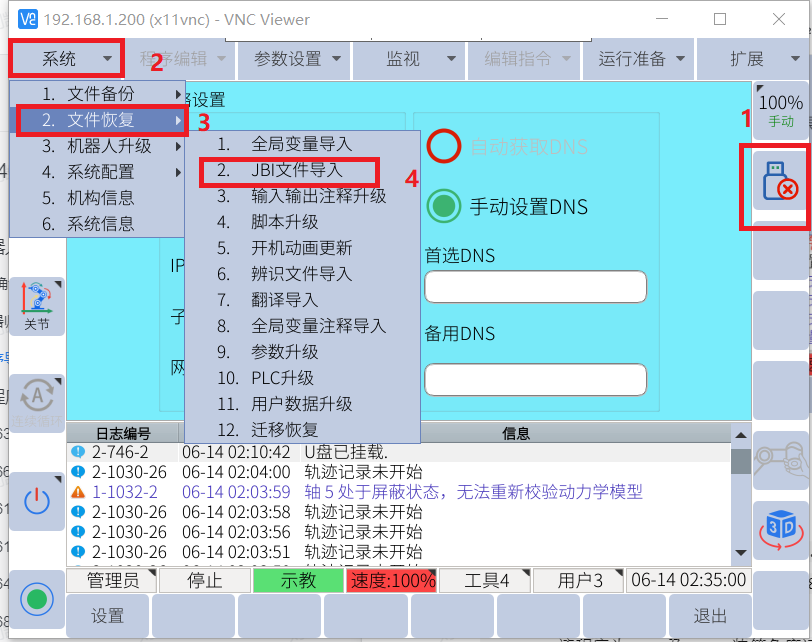 將對應機型打包程序文件放置u盤rbctrl文件夾里,U盤插到控制柜USB接口確認U盤識別成功如圖標簽1,示教器界面打包程序導入如2.34步驟操作如下