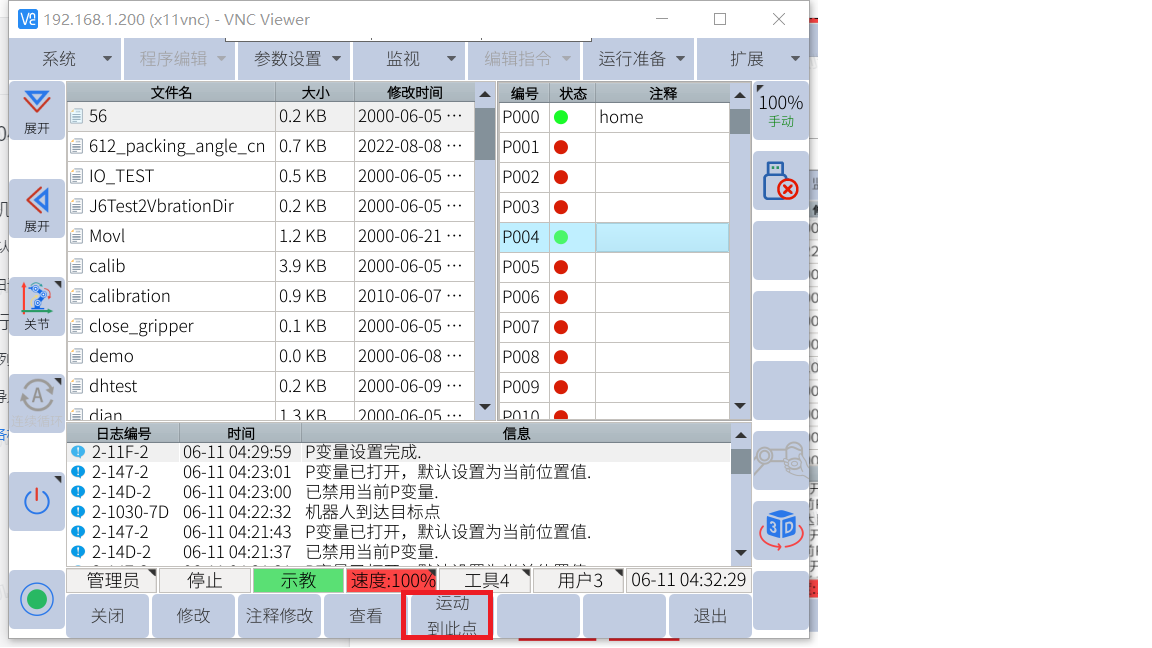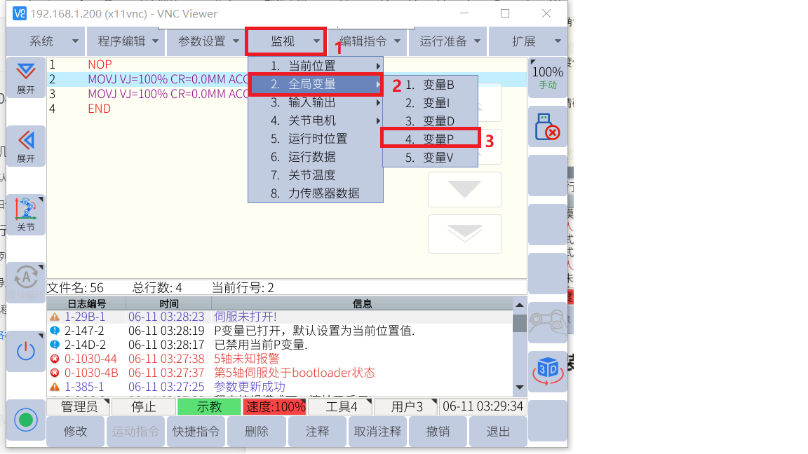 可以用p變量里輸入6個關節(jié)角度回打包位,如下圖步驟選用一個未使用的P變量并打開。根據圖片標簽步驟執(zhí)行。